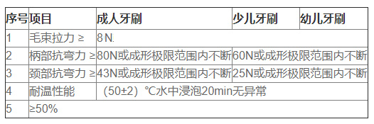 國標GB19342-2003《牙刷》及GB30002-2013《兒童牙刷》中對于牙刷機械強度的牙刷毛束拉力強度、牙刷柄部抗彎力和牙刷頸部抗彎力指標均有明確規(guī)定,相關(guān)參數(shù)如下: