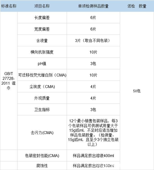外觀質(zhì)量、衛(wèi)生指標、長度偏差、寬度偏差、含液量、橫向抗張強度、包裝密封性能、PH、去污力、金屬腐蝕性、陶瓷腐蝕性、可遷移性熒光增白劑、塵埃度。(僅非織造布生產(chǎn)的濕巾考核含液量,非織造布生產(chǎn)的濕巾不考核橫向抗張強度和塵埃度,僅軟包裝考核包裝密封性)。