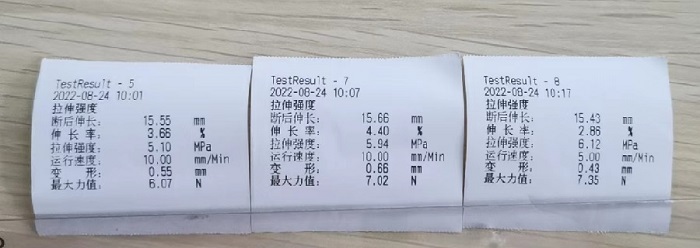 抗拉強(qiáng)度和斷裂伸長率的測試方法一般參照GB/T1040-2006《塑料拉伸性能的測定》:將膜劑裁切成5個長3cm,寬2cm的試樣,每個試樣采用MTL-500N智能電子拉力機(jī)縱向拉伸,選擇“拉伸強(qiáng)度”模式,拉伸速度為10mm/min,直至膜劑斷裂,如圖。儀器自動計算抗拉強(qiáng)度和斷裂伸長率。