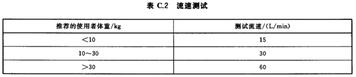 (2)使用裝置,連接裝置與被測器械,按表列出的流速通氣。