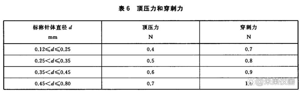 針灸針的針尖部位應(yīng)圓正不偏,無毛刺、彎鉤等缺陷,施加規(guī)定的力與鋼塊接觸頂壓后,其穿刺力應(yīng)不大于表6規(guī)定。