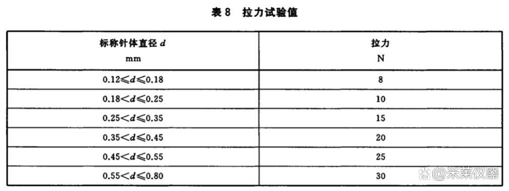 針體與針柄的連接應(yīng)牢固,在表8規(guī)定的力值下作拉力試驗(yàn),二者軸向位移不得大于3mm。先測量針體長度,然后將針體固定在夾具中,在針柄的端面上沿針體軸向緩慢加力作無沖擊拉力試驗(yàn)至表六6規(guī)定的力值后,再測其針體長度。